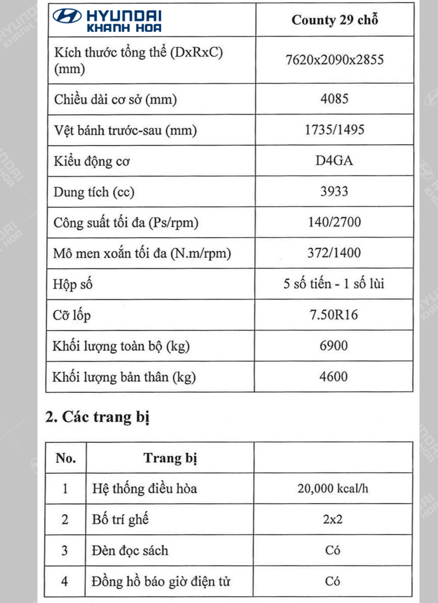 2. Thông số kỹ thuật của xe NEW COUNTY 29 CHỖ