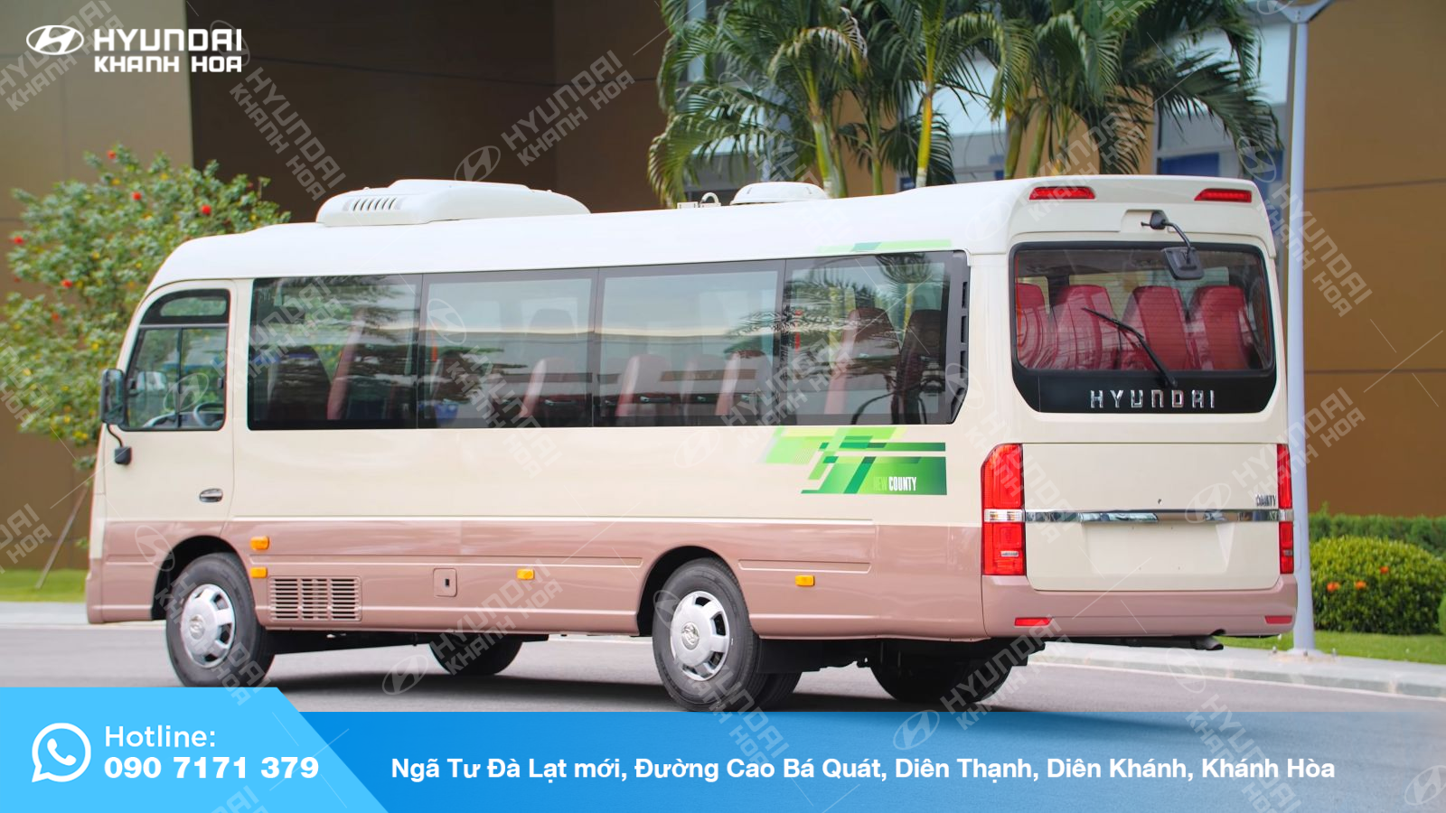 Kích thước tổng thể của xe 29 chỗ New County nhỉnh hơn so với hầu hết các dòng xe trước đó với chiều dài x rộng x cao lần lượt là 7.620 x 2.090 x 2.855 mm. Điều này giúp phần hông xe trở nên thanh thoát, thêm không gian bên trong, tăng công suất,…