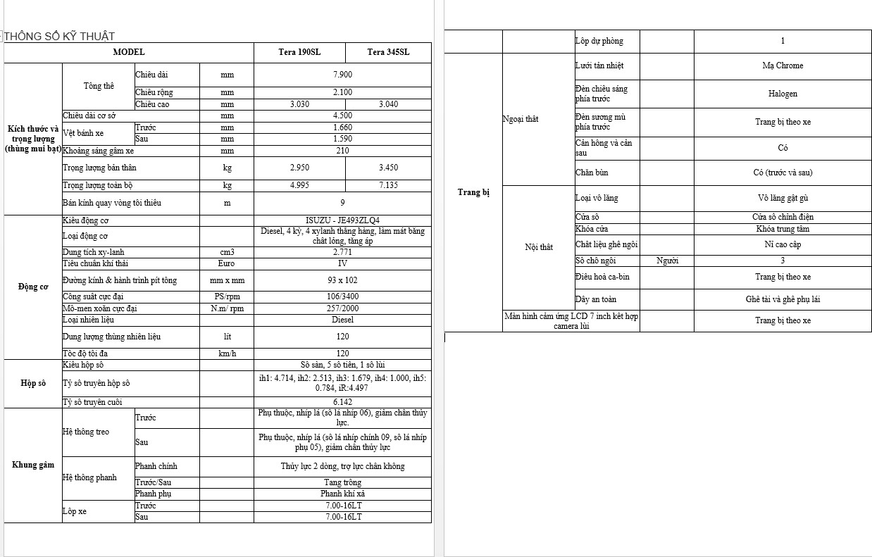 2. Thông số kỹ thuật của xe TERA 190SL & TERA 345SL