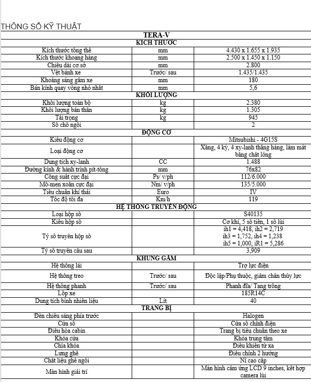 2. Thông số kỹ thuật của xe TERA V