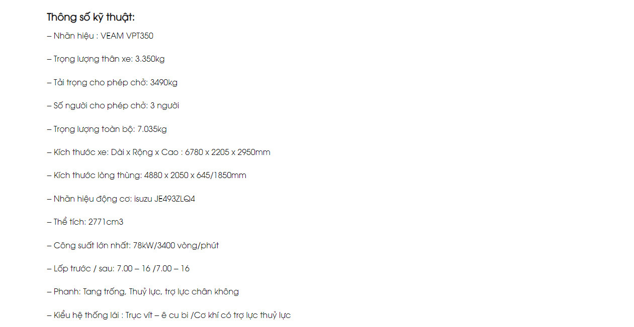 Veam VPT350 3.5 Tấn là dòng xe chú trọng đến công năng và khả năng thu hồi vốn nhanh. Xe phù hợp với hầu hết khách hàng tư nhân và doanh nghiệp có nguồn vốn hạn hẹp.