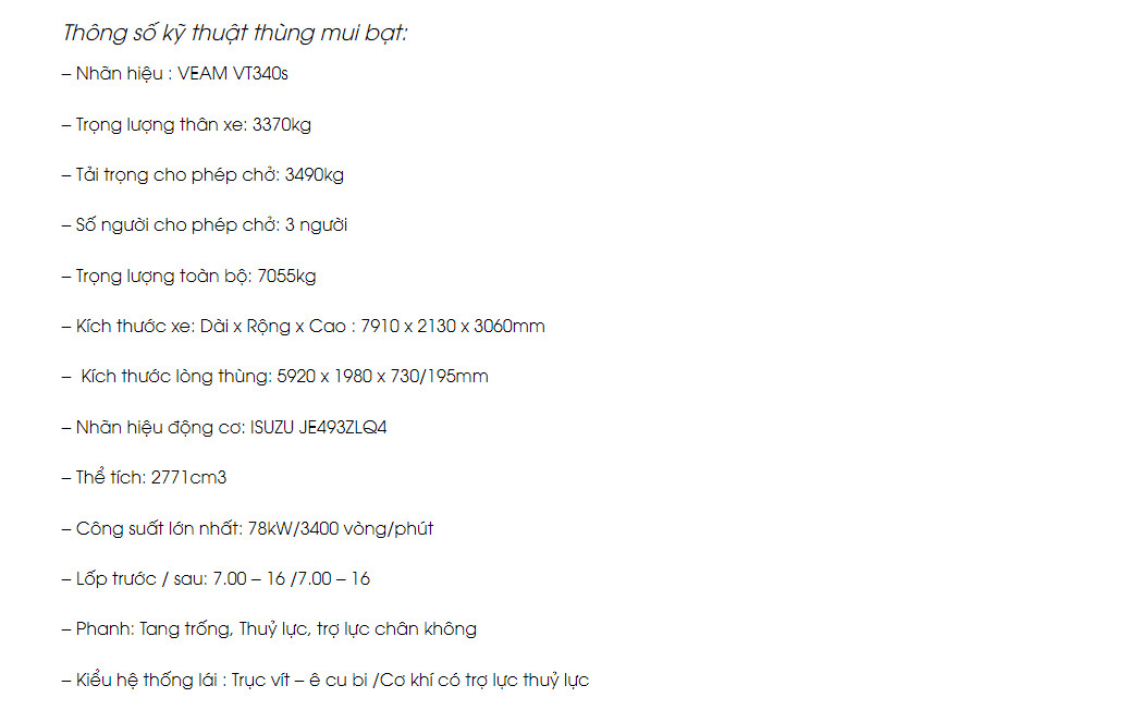 Trên đây là các thông tin về dòng xe VT340S-1 – 3.5 TẤN – Thùng dài 6m2. Hy vọng bài viết trên đã giúp bạn có được những kiến thức hữu ích về dòng xe này nhé!